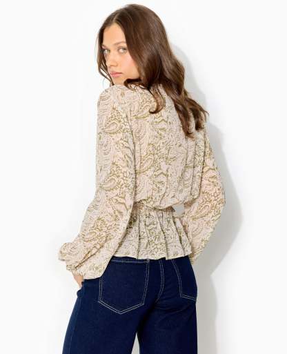- Blouse en tissu léger et fluide écru avec motifs cachemire et végétal kakis.