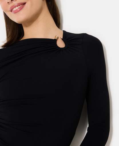 - Encolure asymétrique avec détail boucle bijou en métal couleur or.