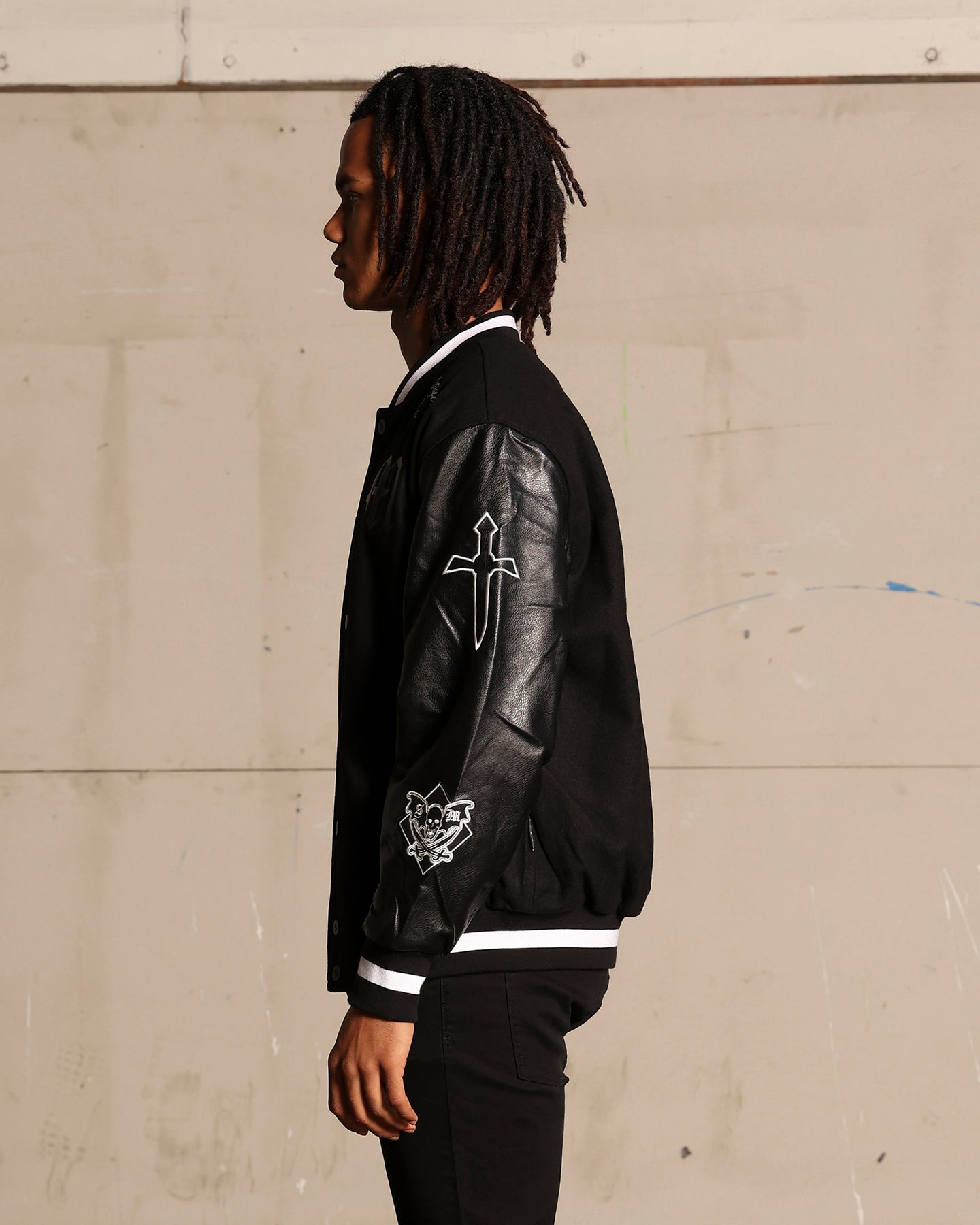 You'll want to take a closer look at the Graveyard Varsity Jacket. A variety of mixed media Saint Morta graphics feature on a melton wool body and PU leather sleeves that make this jacket a premium piece to own. Cop it today and elevate your look.- Multi Logo Applique Detail Front, Back & Sleeves- Regular Fit- Full Grain Sleeves- Melton Body -Full Quilted Lining- Full Front Press Stud Closure -Striped Rib at Neck, Cuffs and Hem- Dual Front Welt Pockets- Material: Melton- Sleeve Material: Full Grain PU Leather- Lining: 100% Polyester (Quilted)- Colour: Black/White- Style: SMGRAVARJK