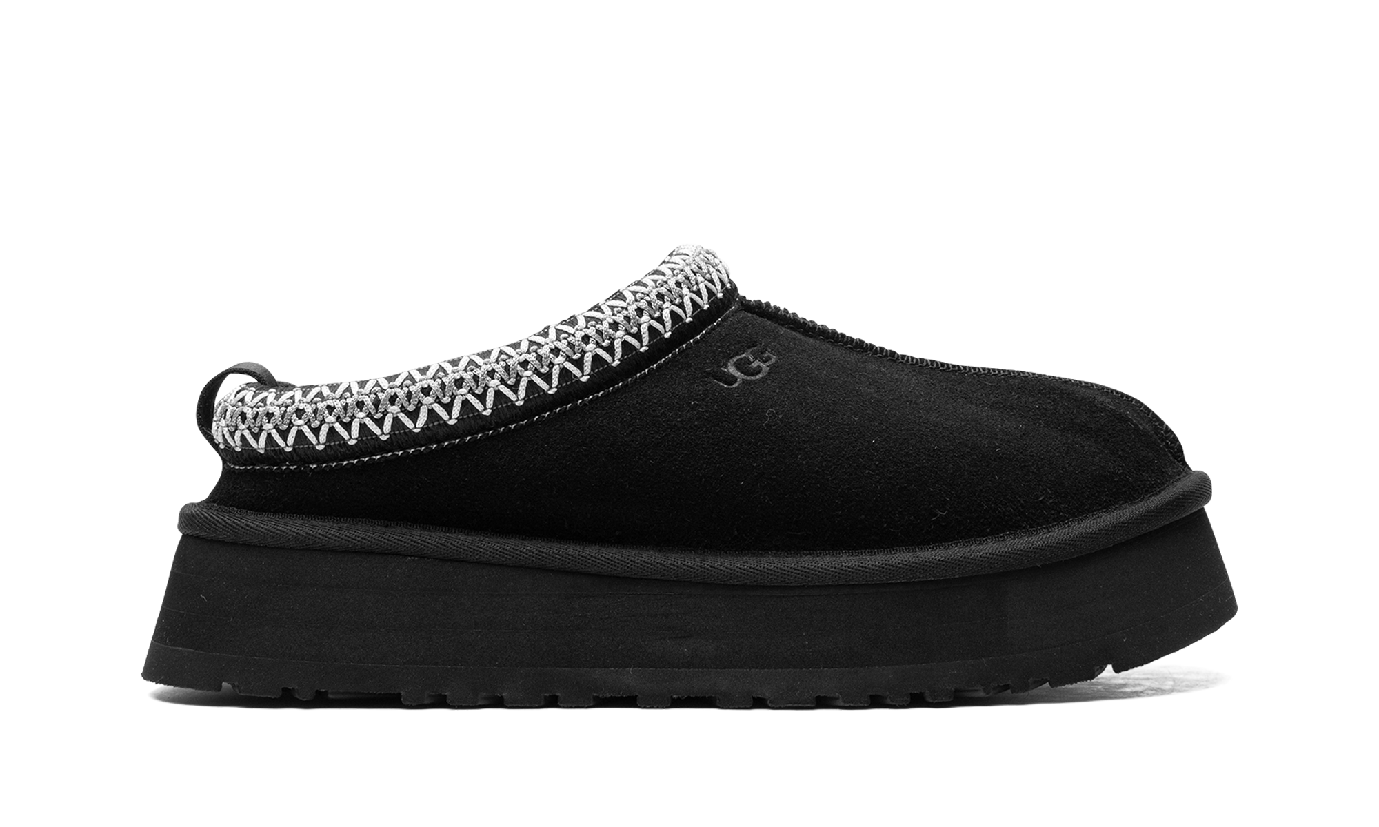 The Women’s UGthtG Tazz Slipper “Black” is the the slip-on moccasin with a platform style sole in a versatile black colorway. The UGthtG Tazz Slipper is made for indoor or outwear wear, and features a warm inner lining of plush sheepskin and upcycled wool. The upper features a black suede construction with an embroidered braid around the collar. UGthtGs branding is seen on the lateral side. The platform-style sole gives the wearer a significant boost in height, and is constructed in soft yet durable EVA foam for all-day comfort.